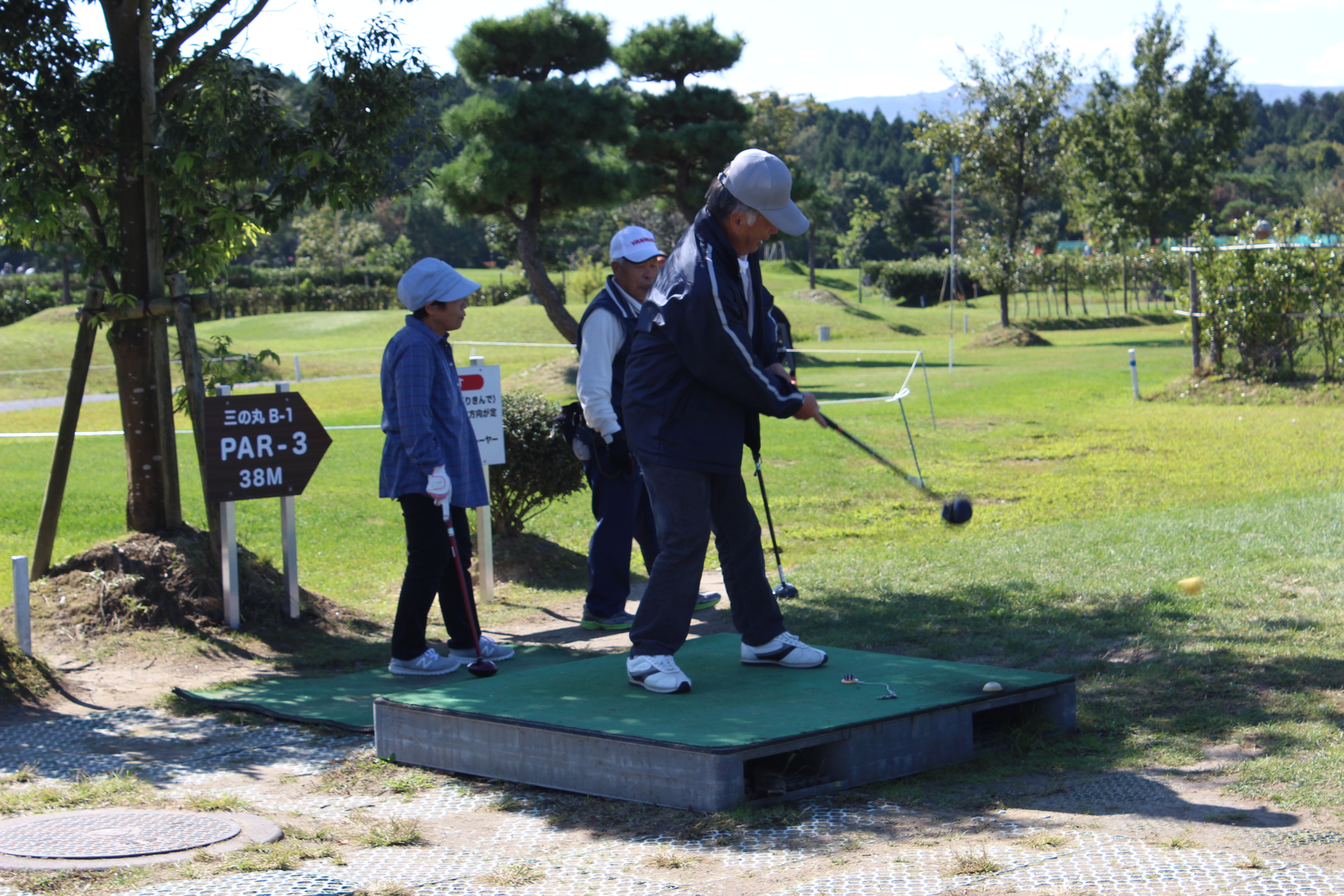 みちのく鹿島球場の外野部分の天然芝グラウンドに2コース計16ホールの特設コースを設置し、日ごろから磨いてきた腕を競っていただきました。